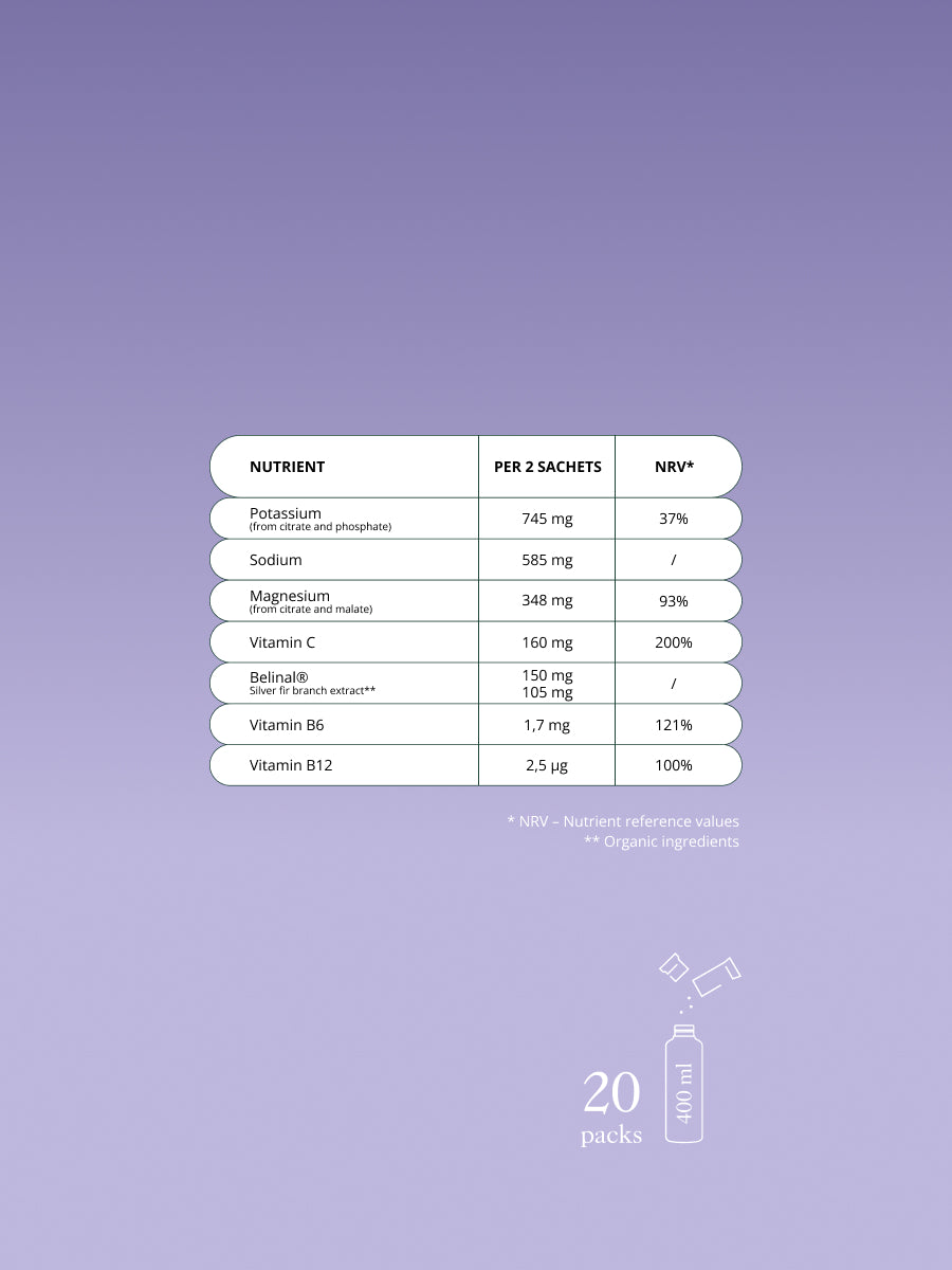 Magnesium citrate, sodium chloride, acid: citric acid, potassium citrate, monopotassium phosphate, magnesium malate, sweetener: xylitol, natural flavours, vitamin C (L - ascorbic acid), Belinal (silver fir (Abies alba) branch extract), sweetener: sucralose, vitamin B6 (pyridoxine hydrochloride), vitamin B12 (cyanocobalamin)