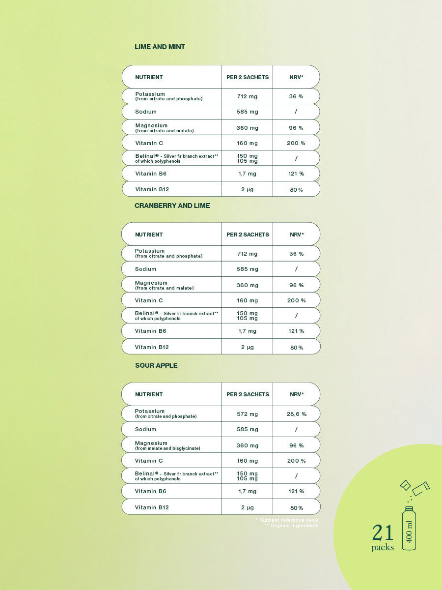Acidity regulator (citric acid), magnesium citrate, sodium chloride, potassium citrate, monopotassium phosphate, natural flavourings, magnesium malate, vitamin C (L-ascorbic acid), colouring concentrate from beetroot, Belinal (sillver fir (abies alba) branch extract), sweetener (sucralose), vitamin B6 (pyridoxine hydrochloride), vitamin B12 (cyanocobalamin)