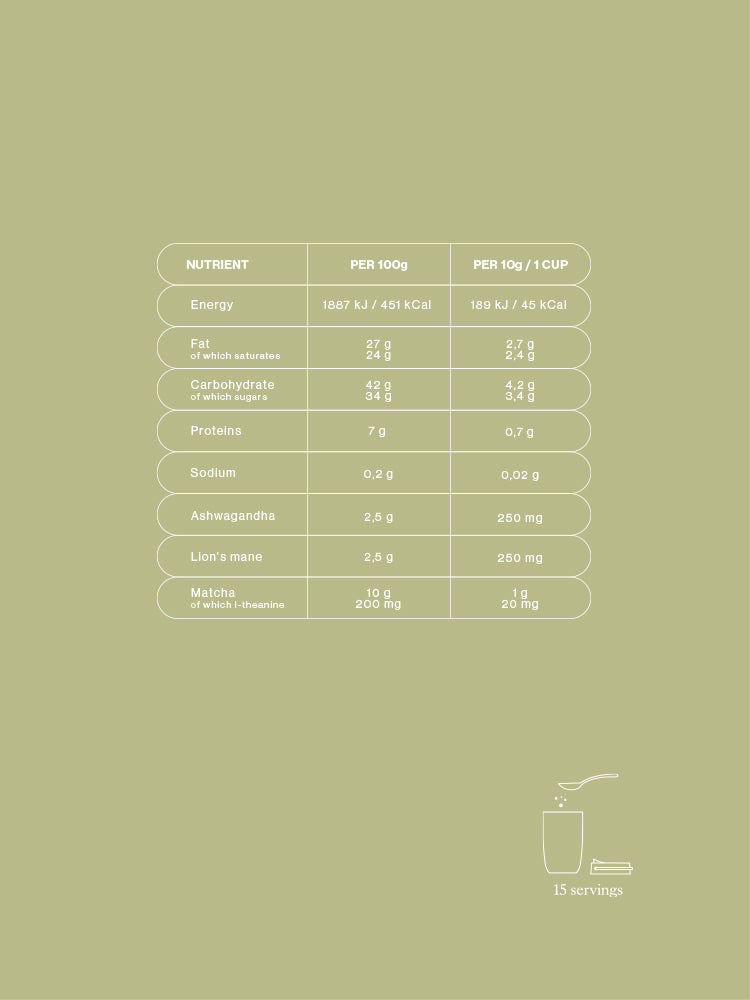 Coconut milk powder (55,4%), coconut sugar, matcha powder (10%), lion’s mane extract (2,5%), cinnamon powder (1%), ashwagandha (0,8%), flavouring.