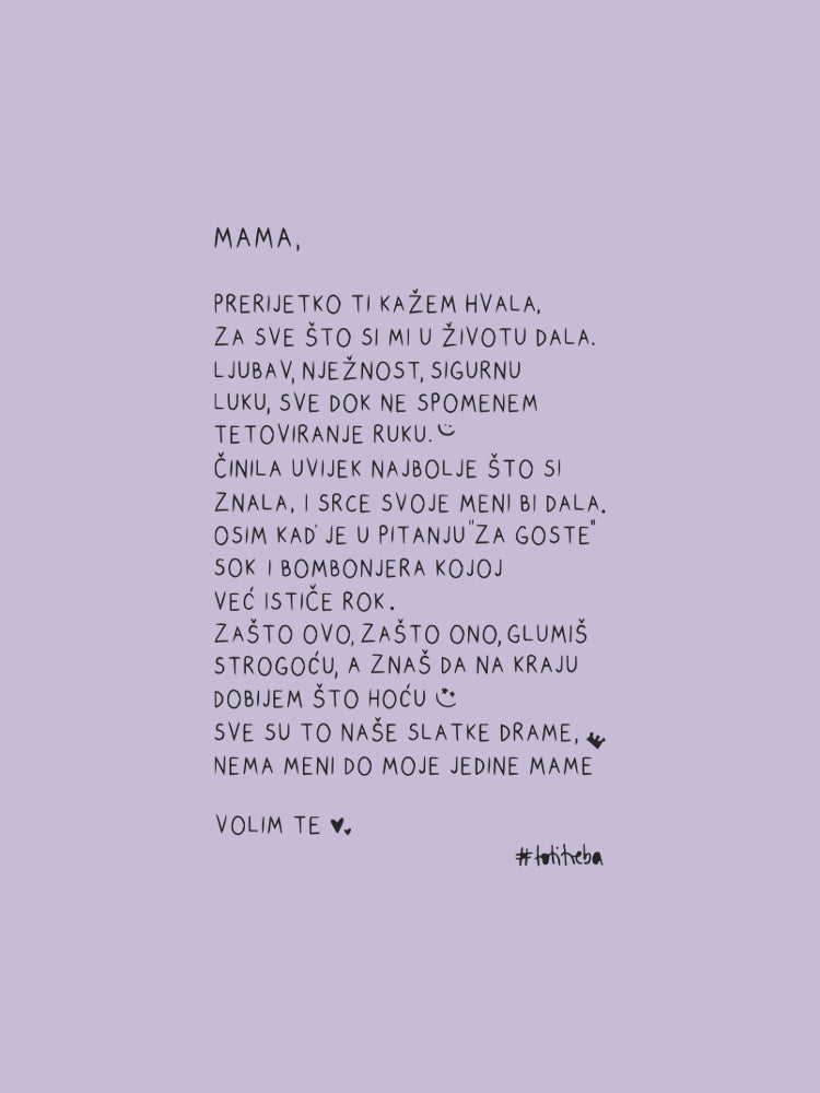 Lorena Ljevar also known as @totitreba on Instagram is brightening our days with original and heart-warming quotes on Instagram. We loved them so much that we decided to turn one into a special, caring, and loving message for your dearest Mum. This unique gift will let her know how much she means to you every single day.