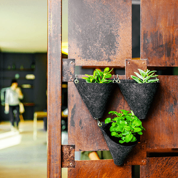 All natural materials: felt and wood. Soft felt has perfect characteristics for treatment of growing plants, since it enables the plants and soil to breath and at the same time hold just the right amount of water and moisture for the plants to enjoy the perfect growing environment.
