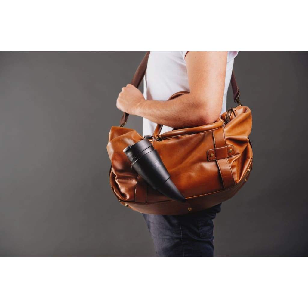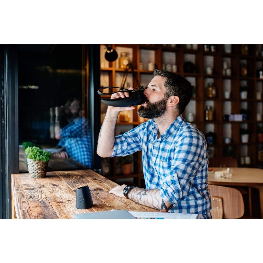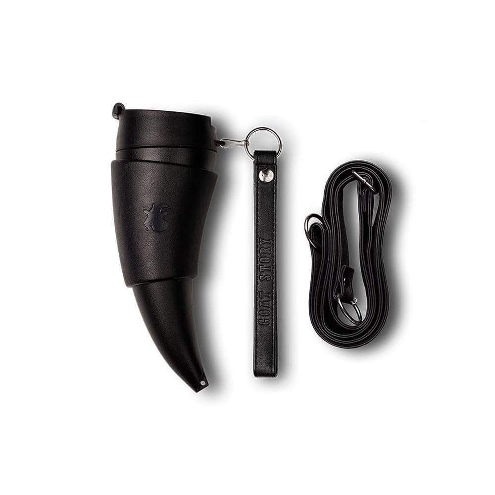 A unique horn-shaped coffee mug that brings style to your coffee drinking. It comes with a set of two faux leather leather straps for easy carrying and a special holder that turns into a stand for your Mug.