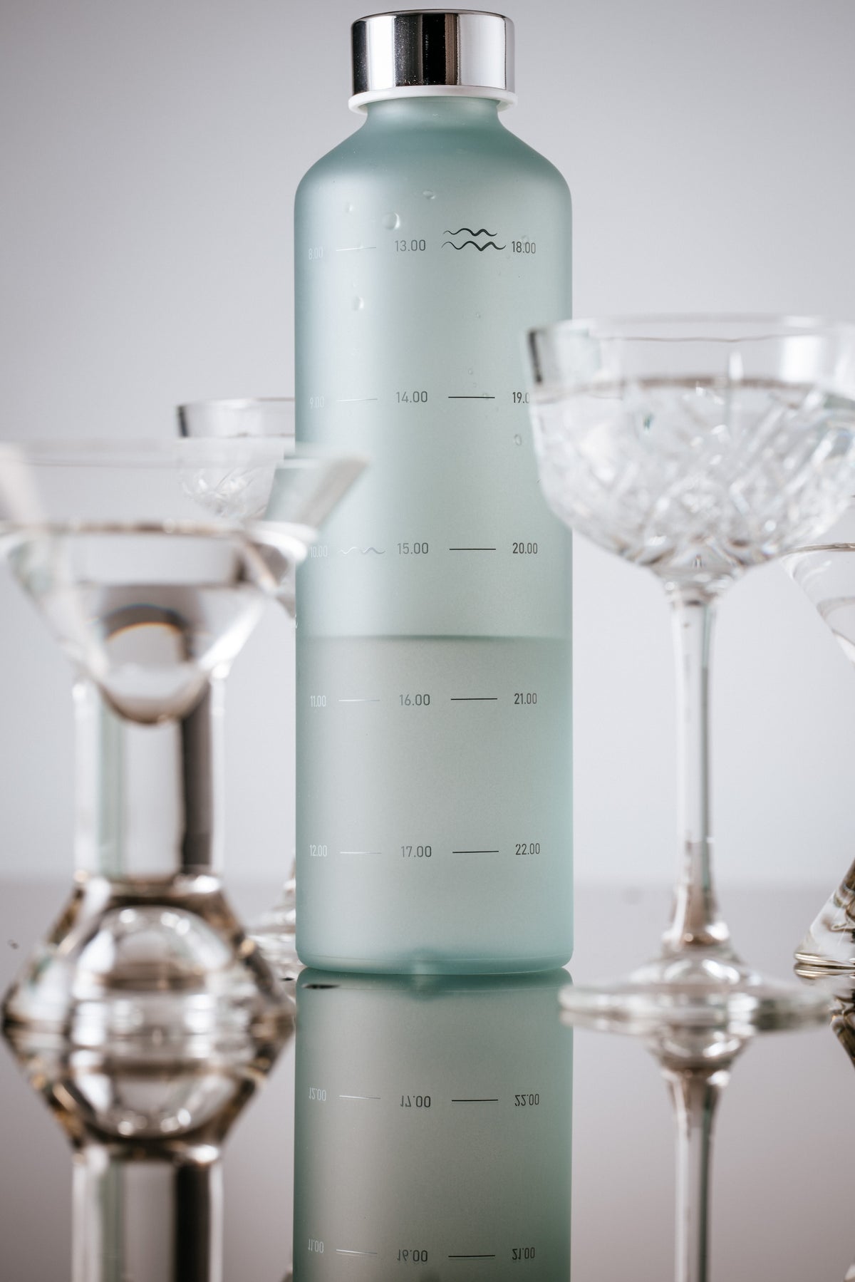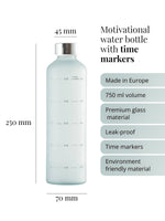 The design of the glass bottle includes easily visible measurements to help you track your water consumption throughout the day.